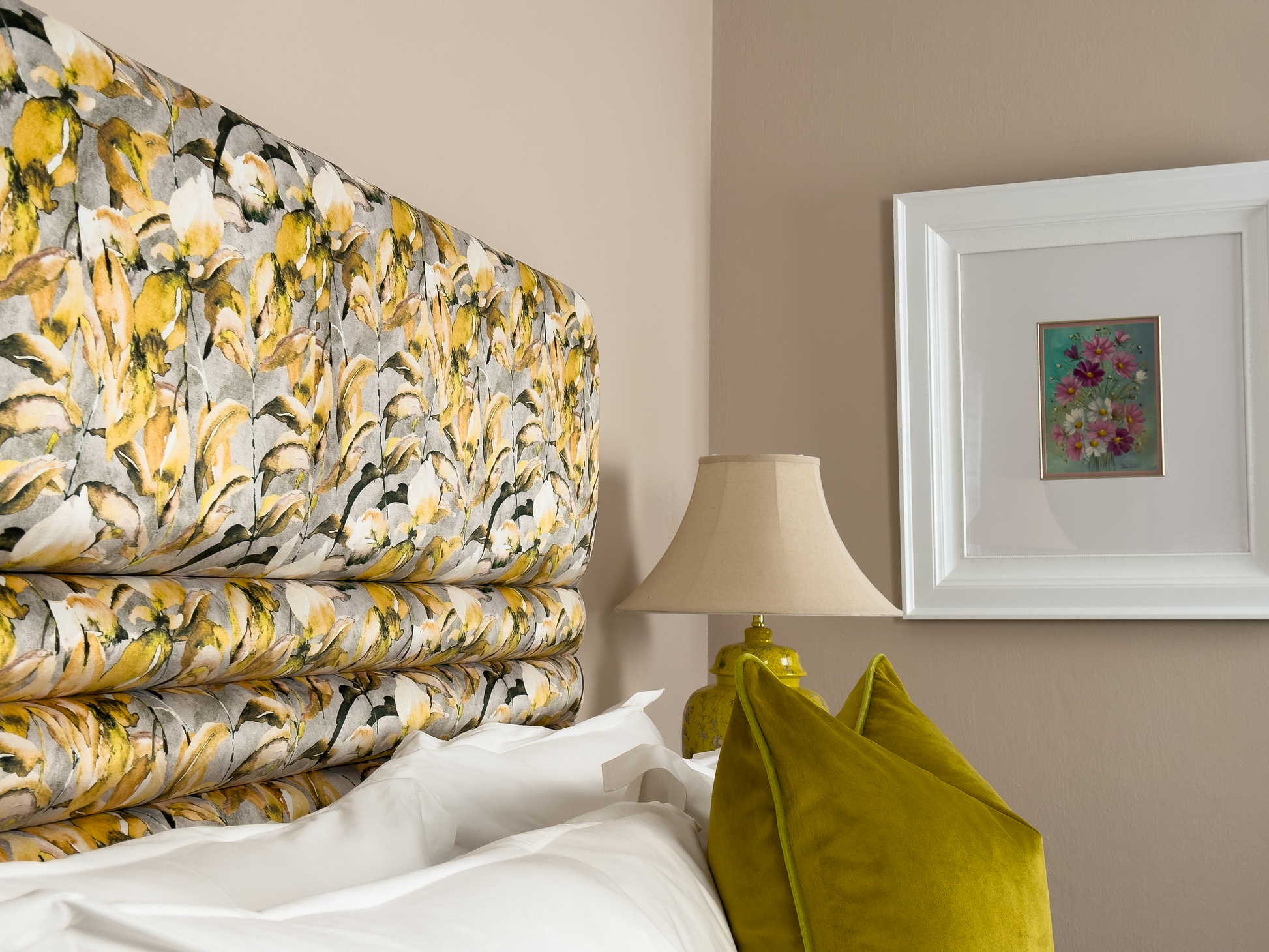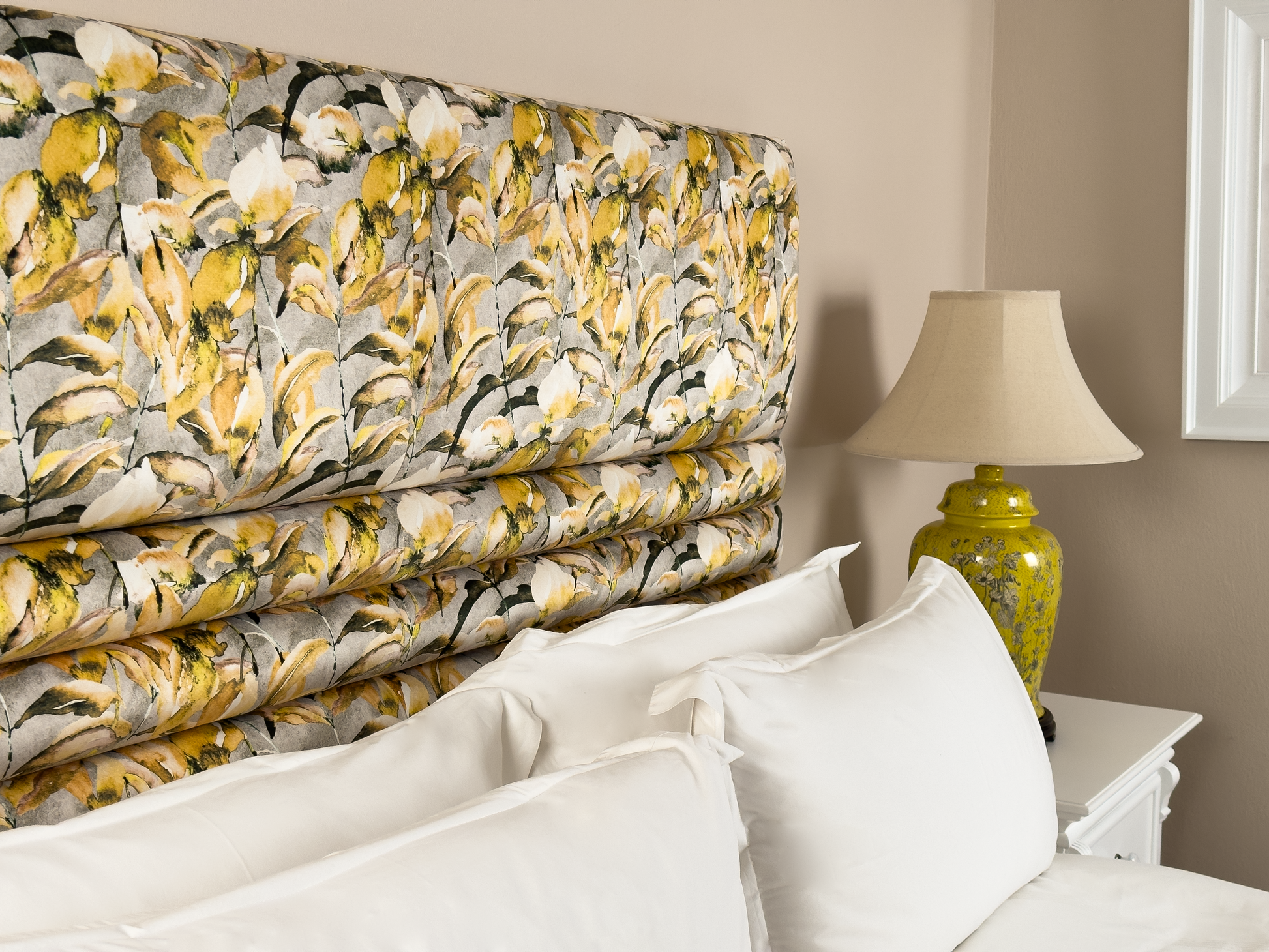 The soft velvet feel together with the double bolster in the centre of the headboard brings a sense of luxury to the bedroom. The fabric contains a stain resistant coating for easy care. The headboard comes complete with a mounting block which can be placed at a height to suit your personal preference.Â